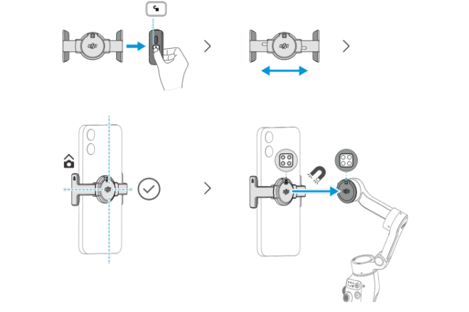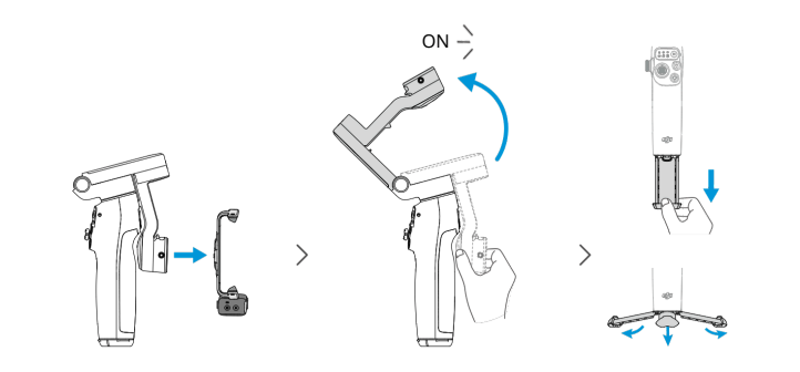 Tháo điện thoại, kẹp điện thoại, và Mô-đun đa năng (Multifunctional Module) cùng lúc. Khi sử dụng lại, lắp chúng lại với nhau và mở gimbal ra để bắt đầu quay.