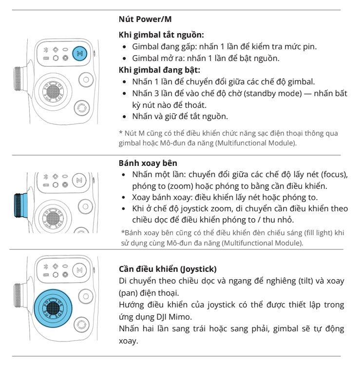 Đèn chế độ ổn định của gimbal sáng liên tục cho biết gimbal đang thực hiện việc ổn định điện thoại. Nếu đèn không sáng sau khi bạn gắn điện thoại, hãy nhấn nút M để kích hoạt chế độ ổn định.