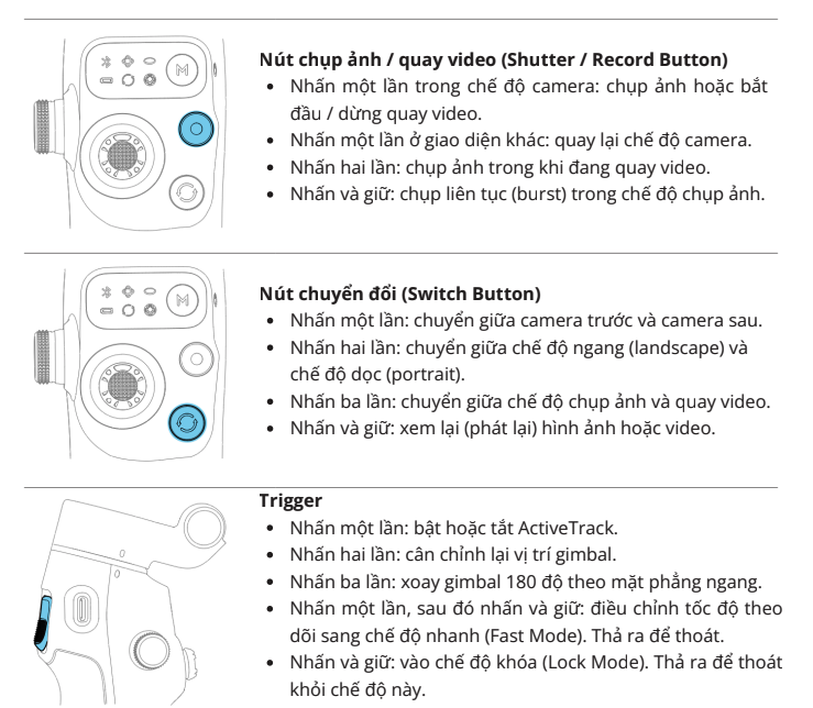 Nhấn hai lần vào trigger để dừng xoay và đưa gimbal trở về vị trí cân bằng.