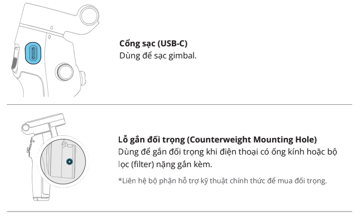 Lưu ý: Chân đế tích hợp phù hợp sử dụng cho các bề mặt phằng ổn định trong môi trường không có gió. Trong các điều kiện khác, khuyến nghị gắn chân đế DJI OM Grip Tripod (bán riêng) vào phần đáy của gimbal.