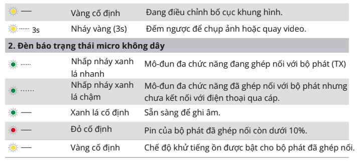 4. Sau khi ghép nối thành công, đèn báo trên Mô-đun đa chức năng sẽ sáng xanh lá cố định. Đèn báo trên bộ phát cũng sẽ hiển thị trạng thái đã ghép nối tương ứng. Bây giờ bạn có thể bắt đầu ghi âm hoặc quay video.