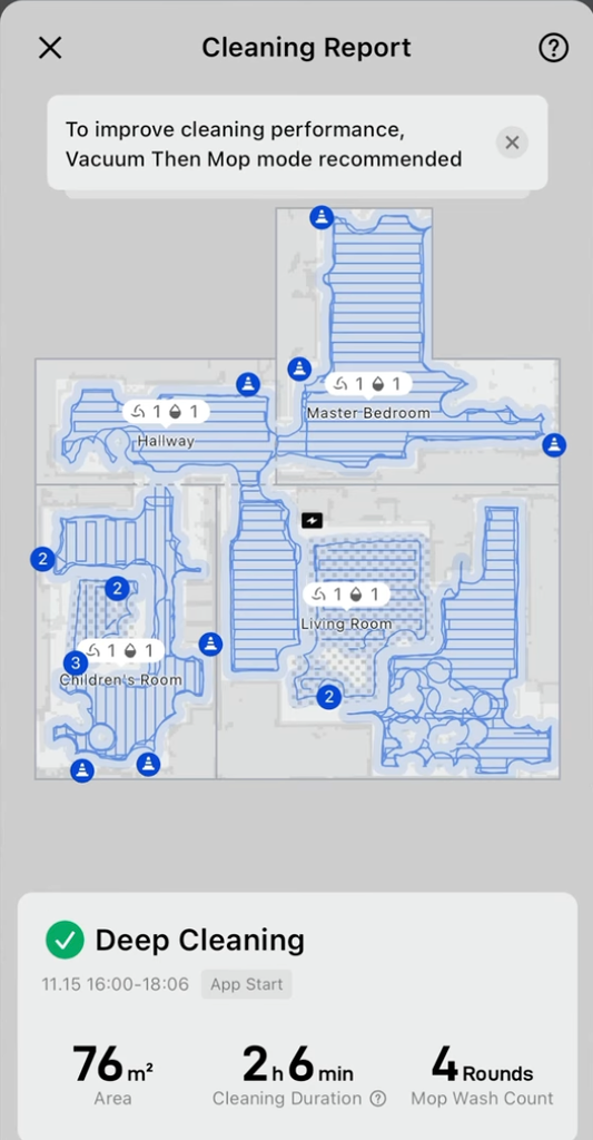 DJI Home hiển thị báo cáo chi tiết sau mỗi lần robot hoàn tất dọn dẹp