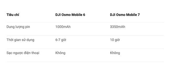 Sản phẩm Osmo Mobile 6 có pin 1000mAh và dùng được trong khoảng 6-7 tiếng, phù hợp cho những thước phim đơn giản trong thời gian ngắn. Còn đối với Osmo Mobile 7 thì mức pin khá cao lên tới 3350 mAh và thời gian sử dụng là 10 tiếng. Dung lượng lớn, thoả sức quay chụp mà không vướng bận pin “không bền”.