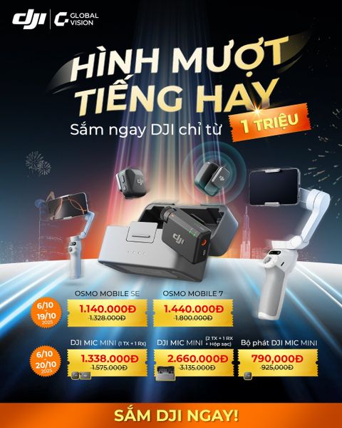 Tháng 10 này, DJI Việt Nam by Global Vision mang đến chương trình Siêu sale 10.10 với hàng loạt sản phẩm chính hãng giảm giá sâu, giá chỉ từ 1 triệu đồng. Đây là cơ hội để người dùng sở hữu các thiết bị quay dựng, thu âm chuyên nghiệp của DJI với mức ưu đãi tốt nhất trong năm, kèm theo nhiều khuyến mãi hấp dẫn và đặc biệt là livestream sale độc quyền trên TikTok Shop lúc 13h30 ngày 10/10.