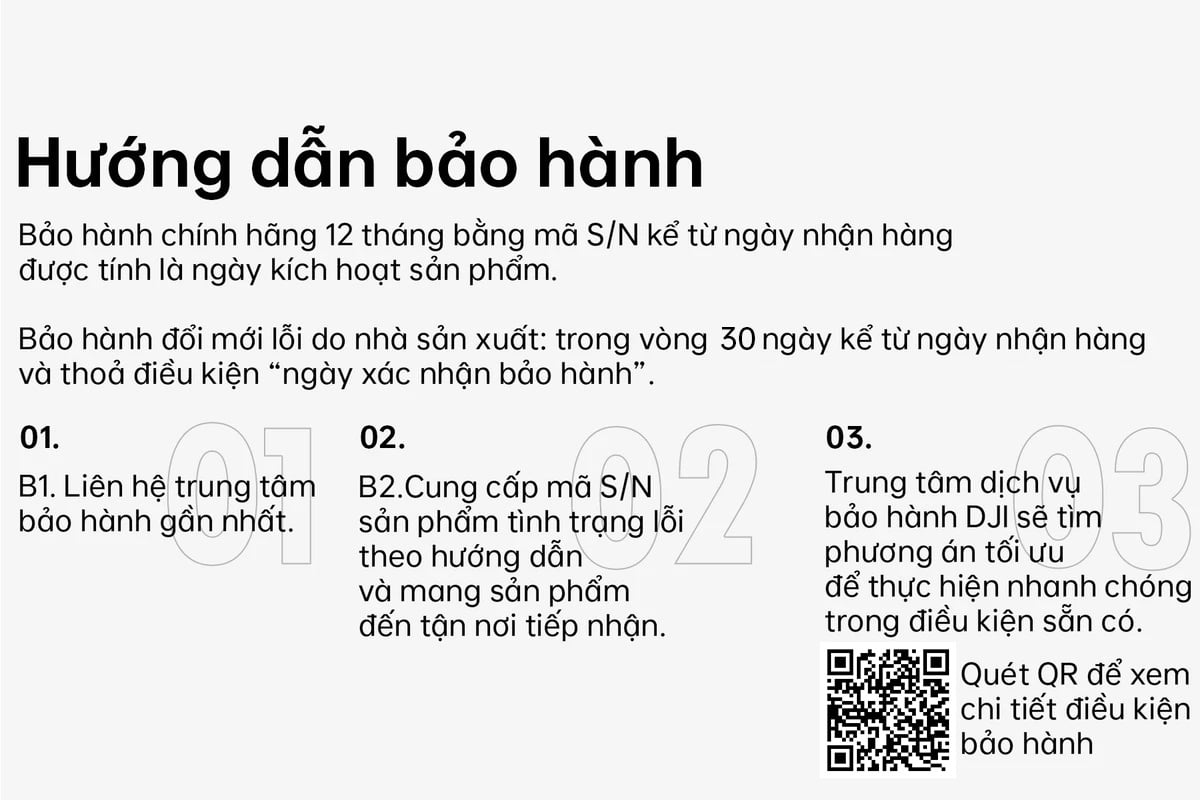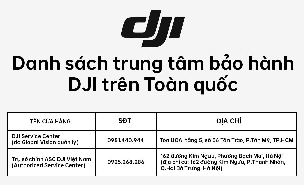 Thời hạn bảo hành cụ thể cho từng dòng sản phẩm và linh kiện (thân máy, gimbal, pin, tay cầm...) được công bố chi tiết và cập nhật liên tục trên website chính thức của DJI by Global Vision.