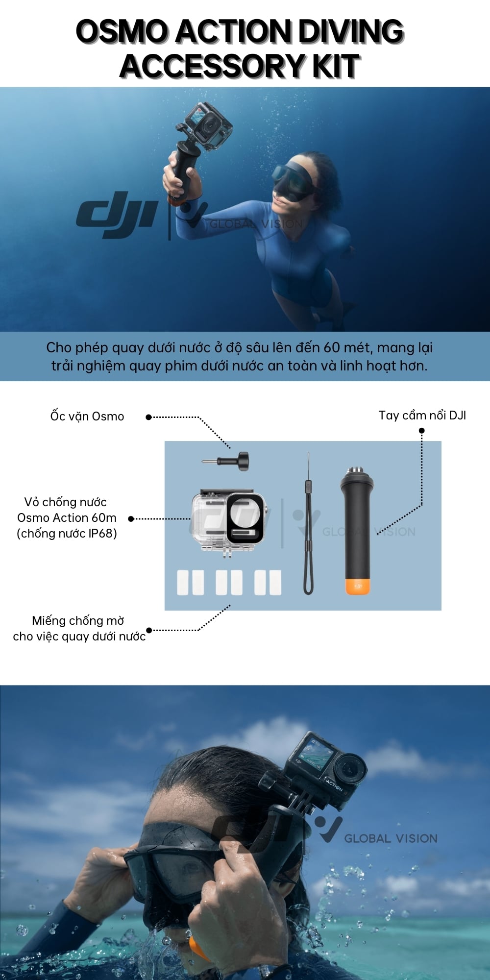 Bộ phụ kiện lặn biển chuyên dụng cho Osmo Action được thiết kế dành riêng cho những ai yêu thích ghi hình dưới nước và muốn khám phá thế giới đại dương một cách an toàn, chân thực. Bộ sản phẩm bao gồm Vỏ chống nước Osmo Action 60m, Tay cầm nổi DJI, Ốc vặn Osmo và Miếng chống mờ, cho phép quay video mượt mà ở độ sâu lên đến 60 mét, mang lại trải nghiệm quay phim linh hoạt, ổn định và chuyên nghiệp trong mọi hành trình lặn biển.