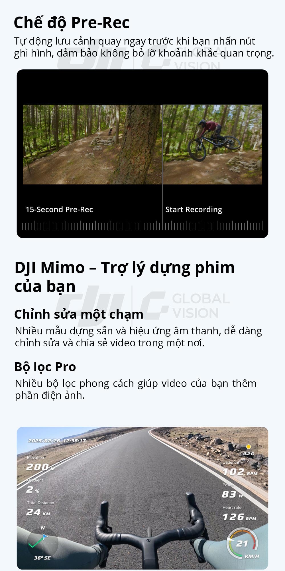 Khi Osmo Nano được kết nối không dây, bạn có thể xem trước cảnh quay theo thời gian thực và tùy chỉnh cài đặt dễ dàng. Ứng dụng DJI Mimo cung cấp nhiều mẫu dựng sẵn và tính năng tạo video một chạm, giúp bạn có những thước phim hoàn thiện nhanh chóng và đơn giản. Ngoài ra, ứng dụng còn hỗ trợ các công cụ chỉnh sửa thông minh như bảng chỉ số thể thao, ảnh động (live photos) và bộ lọc, đáp ứng mọi nhu cầu hậu kỳ, khiến việc sáng tạo dễ dàng hơn và chia sẻ ấn tượng hơn.