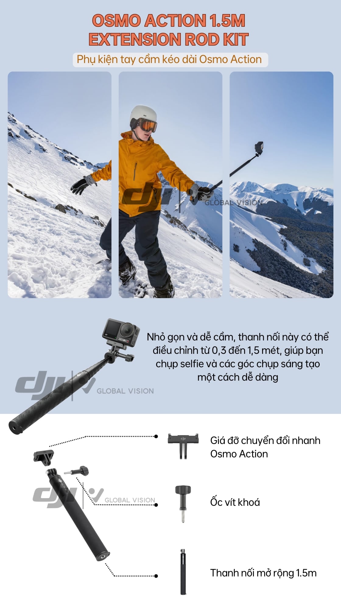 Gậy chụp ảnh cầm tay nối dài 1.5m DJI dành cho Osmo Action tương thích nhiều dòng DJI Osmo Action. Dù bạn đang đi du lịch thám hiểm, đi phượt hay tham gia vào các hoạt động thể thao thì đây là phụ kiện không thể thiếu trong bộ sưu tập của bạn.