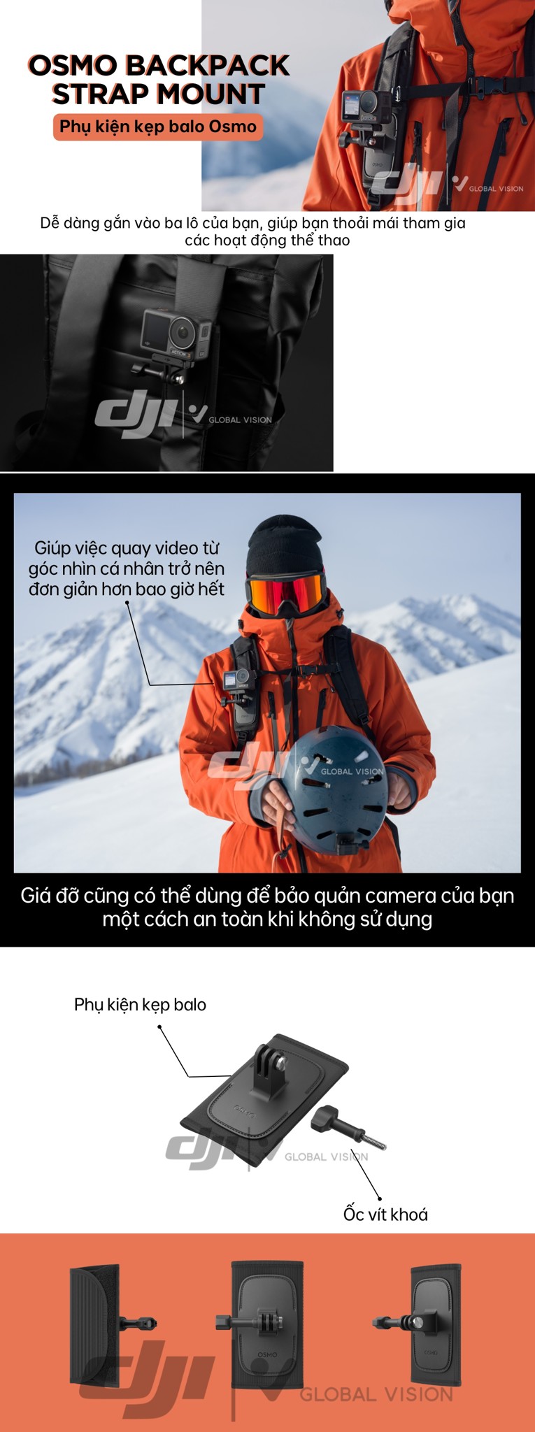 Phụ kiện kẹp balo Osmo được thiết kế để gắn trực tiếp lên dây đeo ba lô, giúp bạn dễ dàng ghi lại góc nhìn POV (Point of View) trong các hoạt động giải trí như đi bộ đường dài, leo núi hoặc du lịch. Với thiết kế chắc chắn và tiện lợi, phụ kiện này giúp giữ cố định thiết bị Osmo trong quá trình di chuyển, mang lại những thước phim chân thực và sống động từ góc nhìn của người dùng.